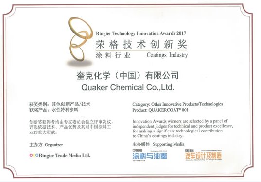 中国粉体网讯 2017年5月24日,在上海举行的涂料行业—荣格技术创新奖颁奖典礼上,奎克凭借高性能快干型水性涂料QUAKERCOAT® 801再度获得殊荣。