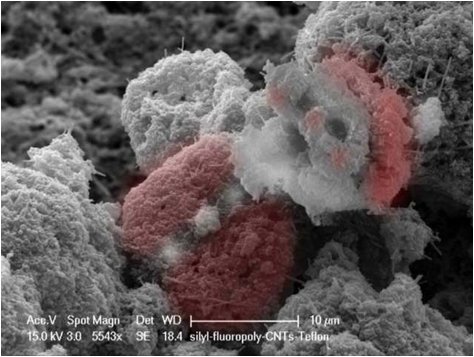纳米圣诞老人拿着一包纳米管。这是在超疏水纳米复合涂料的表面上发现的。通过一些图像处理来添加色彩从而显得更加漂亮。