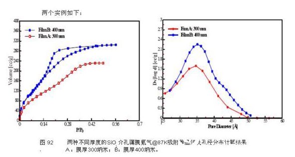 气体吸附法是 10 纳米左右孔的常规表征方法。一般而言,氮气、氩气和氪气在 77.35K 或 87.27K 的吸附可用以计算多孔材料的比表面积、孔径、孔分布和孔容,却不能用常规的氮气和氩气对薄膜材料进行表征。这是由于薄膜材料的总孔体积和表面积都非常小,因此由吸附所产生的压力差也极小。