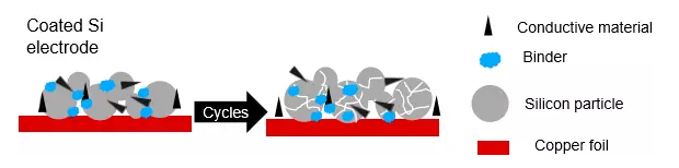 硅的不断膨胀,在电池内部产生很大的应力,这种应力对极片造成挤压,循环多次后可能出现极片断裂的情况。而降低膨胀率需要优化复合工艺,使用粒径更小的纳米硅粉并且尽可能均匀地复合到石墨颗粒的表面,这也是硅碳负极产业化的一大难题。