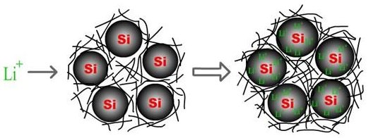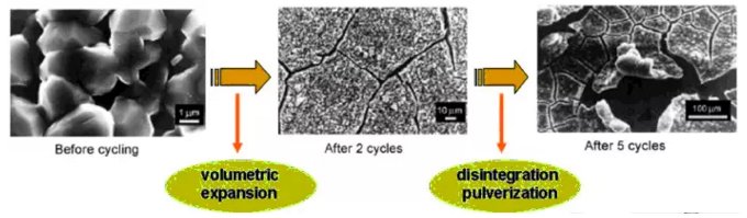 硅负极低的循环寿命源于其在充放电过程中存在巨大体积膨胀。充电时锂离子从正极材料脱出嵌入硅晶体内部晶格间,造成了很大的膨胀(可达300%,石墨仅为10%),形成硅锂合金;而放电时锂离子从晶格间脱出,又形成了很大的间隙。这种现象将导致如下结果: