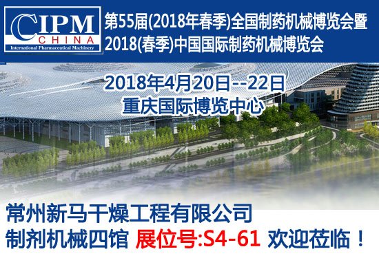 由中国制药装备行业协会主办的CIPM CHINA 2018第55届(2018年春季)全国制药机械博览会暨2018(春季)中国国际制药机械博览会,定于2018年4月20日至22日在重庆国际博览中心召开。常州新马干燥工程有限公司在制剂机械四馆S4-61展位期待您的莅临!