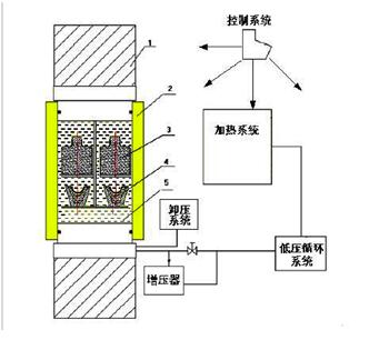 1-机架2-超高压缸3-成形件1(软模)4-成形件2(组合模)5-高温传压介质