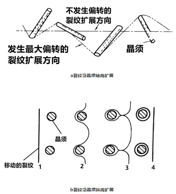 裂纹扩展到达晶须时,被迫沿晶须偏转,这意味着裂纹的前行路径更长,裂纹尖端的应力强度减少,裂纹偏转的角度越大,能量释放效率就越低,增韧效果就越好,断裂韧性就提高。如图a、b所示。图b表示:①裂纹和晶须相遇;②裂纹弯曲向前③在晶须前面相接④形成新的裂纹前沿并留下裂纹。