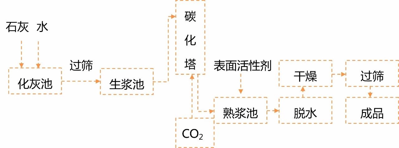 碳化法是纳米碳酸钙的主要生产方法。将精选的石灰石煅烧,得到氧化钙和窑气。使氧化钙消化,并将生成的悬浮氢氧化钙在高剪切力作用下粉碎,多级旋液分离除去颗粒及杂质,得到一定浓度的精制氢氧化钙悬浮液;然后通入CO2气体,加入适当的晶型控制剂,碳化至终点,得到要求晶型的碳酸钙浆液;再进行脱水、干燥、表面处理,得到纳米碳酸钙产品。