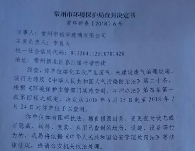 而该玻璃厂的关停,是缘于常州市环保局开出的一份查封决定书,书面显示:裕华玻璃厂熔化工段产生废气,未建设废气治理设备,违反了《大气污染防治法》第二十条,根据有关规定,决定从2018年6月25日起至2018年7月24日予以查封。
