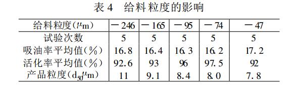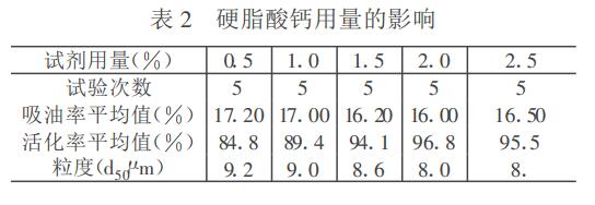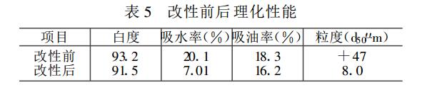 改性效果采用活化率和吸油率两项指标评价,活化率越高、吸油率越低,改性效果越好。粉碎效果用产品粒度评价,用激光粒度仪测定。采用气流粉碎机超细与改性一体化工艺处理后的产品性能发生了很大变化。产品粒度(d50)达8.0μm,吸油率16.20%,二十天吸水率为7.01%,产品白度略有下降,但不影响其应用。重质碳酸钙已由亲水性填料转变为亲油疏水性填料。