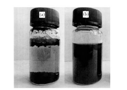 石墨烯(a)和硅烷化处理的石墨烯(b)在水中的分散性照片