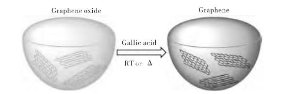 Jing采用具有强还原能力的没食子酸作为稳定剂和还原剂,制得了具有高分散性的石墨烯。由于分子中苯环结构和石墨烯之间形成了π—π共轭相互作用,从而作为稳定剂吸附在石墨烯表面,这使得石墨烯片层具有较强的负电性,阻止了石墨烯片进一步堆积在一起,使其更加难于团聚,保证了所制备的石墨烯具有较高的分散性能。