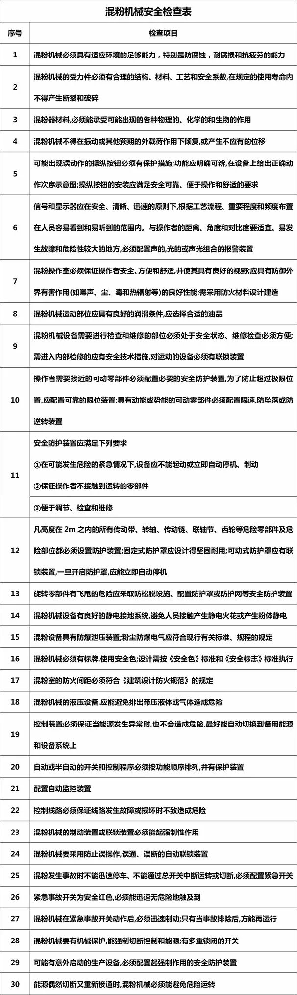 针对该类较强爆炸特性药粉的生产企业的混粉机械装置,研究者编制和设计了安全检查表,此安全检查表的设计系统综合考虑了各种因素的影响,判定和检查危险,具有较强的针对性,严格安全检查,达到检查表中的各项规程,从而形成系统化管理。