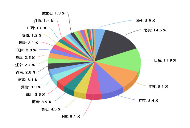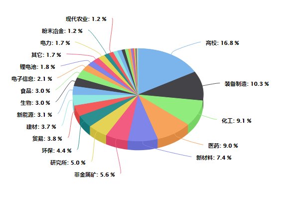 综合买家的地区与行业分布数据可以看出,粉享通服务的5万+买家主要集中在北京、山东、江苏、广东、上海、浙江、河南等地区,其中,北京、山东、江苏三地的买家占了总数的35.5%;所属行业则主要集中在高校、装备制造、化工、医药、新材料、非金属矿、环保等,其中高校、装备制造、化工三个行业的买家占了总数的36.2%。