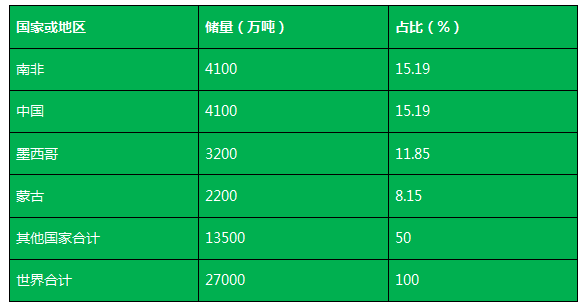 数据显示,2017年全球萤石矿资源矿物量约5亿吨,查明的储量约2.7亿吨矿物量。其中,南非、中国、墨西哥与蒙古的萤石储量位列世界前四,共计约占全球总量的50.4%。其中,中国萤石储量与南非并列第一,均达到4100万吨,占世界总储量15.19%。