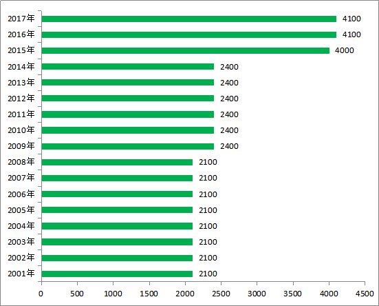 2001-2017年中国萤石资源储量情况(单位:万吨)