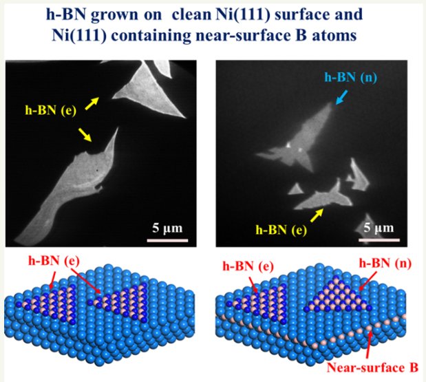 中科院大连化学物理研究所包信和院士和傅强研究员团队,以“近表层B对Ni(111)表面六方氮化硼(h-BN)外延生长的调控”为示例,借助于低能电子显微镜(LEEM)和光发射电子显微镜(PEEM)的原位动态表征,系统研究了近表层物种在二维原子晶体生长过程中的影响和作用。发现在干净的Ni(111)表面仅形成外延h-BN结构;而近表层B被引入到Ni(111)表面后,它弱化了所形成的h-BN与Ni(111)之间的相互作用,导致非外延h-BN结构的形成。同时还观察到非外延h-BN在高温退火时转变为外延h-BN结构,证明Ni(111)表面外延h-BN在热力学上更稳定。该研究还提出氨化驱动近表层B物种的表面偏析生长h-BN的新方法。这一研究为调控二维原子晶体的外延特性提供了新途径。