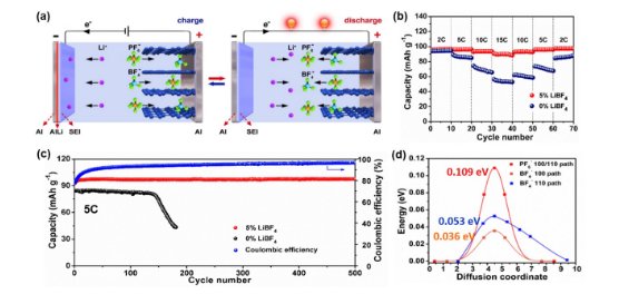 为了提高阴离子插层的动力学和稳定性,唐永炳及其团队成员申京受、张帆、欧学武等人首次提出了一种阴离子杂化策略,并成功构建了基于Li+/PF6-/BF4-的多离子电池。电化学测试及理论计算研究表明,通过杂化适量具有离子半径较小的BF4-阴离子,能显著降低扩散能垒,并提升扩散动力学,从而大幅提高了该电池的倍率和循环性能。该电池在15C(4分钟充电)的高电流密度下,容量保持率达到92.5%;在5C的电流密度下循环500次后容量几乎无衰减。该阴离子杂化策略为发展高效低成本储能器件提供了新思路。