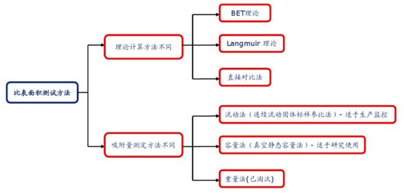 比表面测试方法根据测试思路不同分为吸附法、透气法和其它方法。透气法是将待测粉体填装在透气管内震实到一定堆积密度,根据透气速率不同来确定粉体比表面积大小,比表面测试范围和精度都很有限;其它比表面积测试方法有粒度估算法、显微镜观测估算法,已很少使用;其中吸附法比较常用且精度相对其它方法较高。