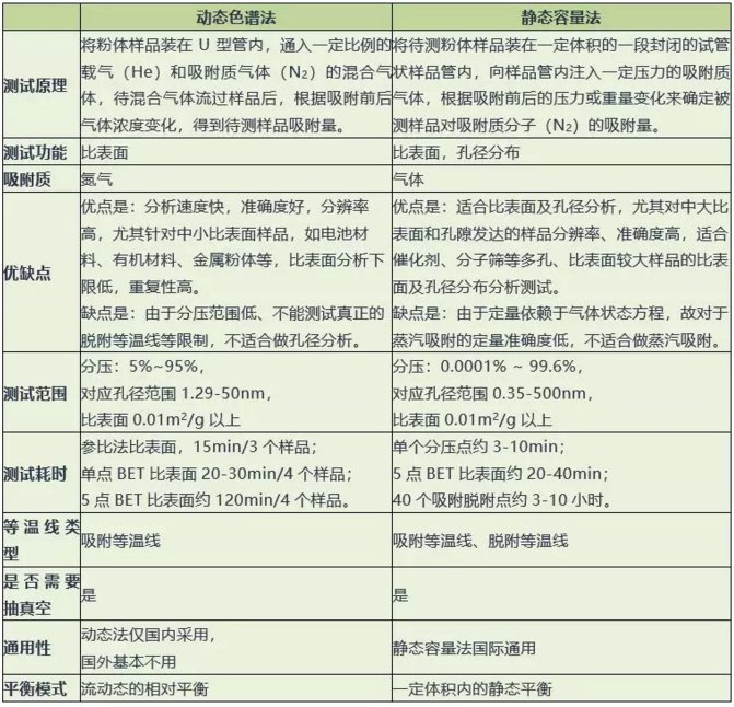 氮吸附法根据吸附过程和吸附质确定方式的不同又分为动态色谱法和静态法。动态色谱法和静态容量法是目前常用的主要的比表面测试方法。两种方法比较而言,动态色谱法比较适合测试快速比表面积测试和中小吸附量的小比表面积样品(对于中大吸附量样品,静态法和动态法都可以定量的很准确),静态容量法比较适合孔径及比表面测试。