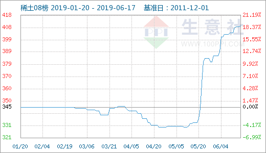 中国粉体网讯 6月17日稀土指数为410点,较昨日上升了1点,较周期内最高点1000点(2011-12-06)下降了59.00%,较2015年09月13日最低点271点上涨了51.29%。(注:周期指2011-12-01至今)。