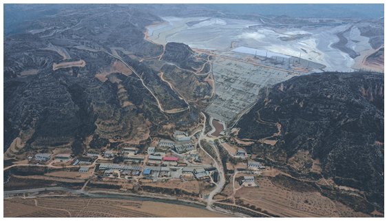 4月8日,俯瞰原则沟赤泥库。赤泥库坝下游正对沟口有10户村民,两侧300米范围内约有25户。