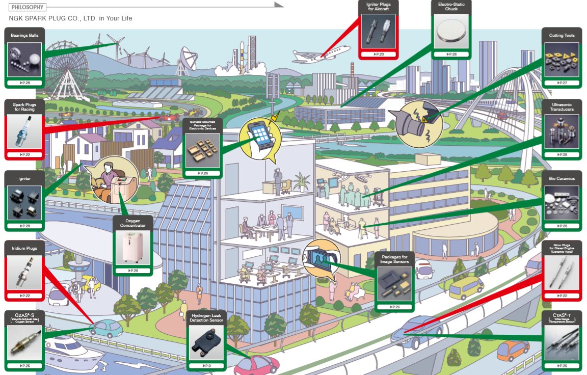 为实现机动化社会,需要达到的品质要求有安全性、舒适性、便利性以及环境性能。日本特殊陶业除了全球市场占有率第一的火花塞以外,一直致力于开发拥有优秀环境效率的产品。今后依旧会以优越的技术和广受信赖的品质,为世界追求的新汽车社会做出贡献。