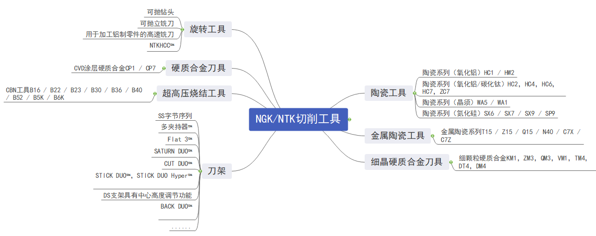 这些工具用来切削汽车零件、飞机零件和其他工业用零件。除了陶瓷以外,NTK也开发了超微粒钨钢制造的切削工具与全新高科技材料制造的切削工具。