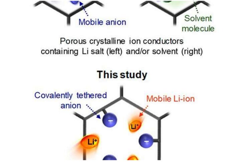 Lee教授利用多孔晶体材料作为离子导体,比如共价有机骨架(COF),来解决这一问题。通过在材料内部有规律地安排锂离子通道,极大地提高离子传导性能。这项研究的第一作者、UNIST能源与化学工程学院的Kihun Jeong博士说:“新开发的离子导体是一种完全不使用液体的固相载体,实现固态单锂离子的导电行为。”