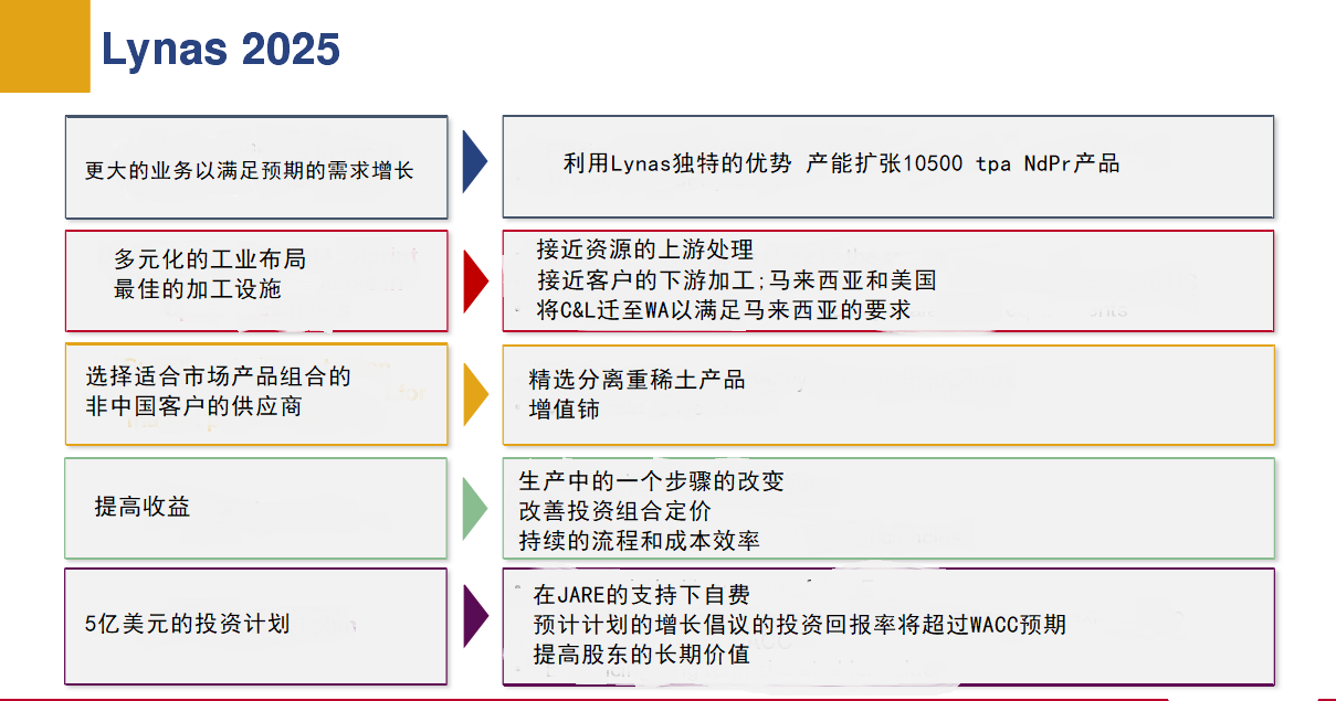Lynas公司(Lynas Corporation Limited)成立于1983年,原名为伊尔甘吉黄金有限公司。1985年该公司在采用了Lynas这个名字。1986年在西澳大利亚注册并于澳大利亚证券交易所(ASX)上市的上市公司,2001年,该公司出售了黄金业务,专注于稀土开采、精炼分离、初产品制造。目前该公司有两大业务板块:位于澳大利亚西部Mount Weld的采矿和浓缩工厂及位于马来西亚宽滩的炼油设施。