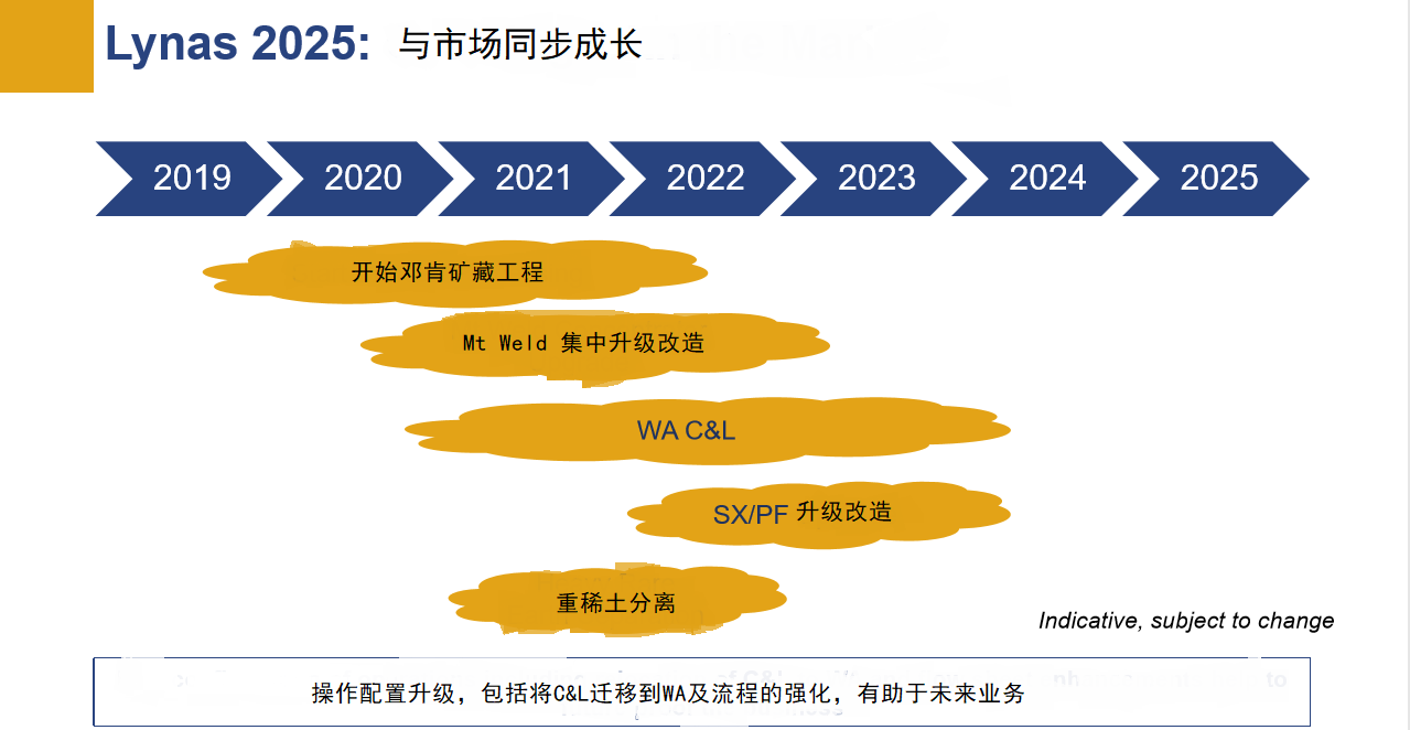 Lynas最初的采矿活动在2008年6月顺利完成,共开采了773300吨矿石,平均品位为REO 15.4%。2011年9月,获得西澳大利亚当局许可,将钻探计划扩展到中央镧系矿床的西侧。同年,西澳大利亚州政府也批准Mt Weld稀土浓缩厂运营。2011年5月14日,第一批破碎矿石在Mt Weld稀土浓缩厂投产。后期因澳大利亚政府相关部门的环保监管,稀土提炼工厂转移至马来西亚。