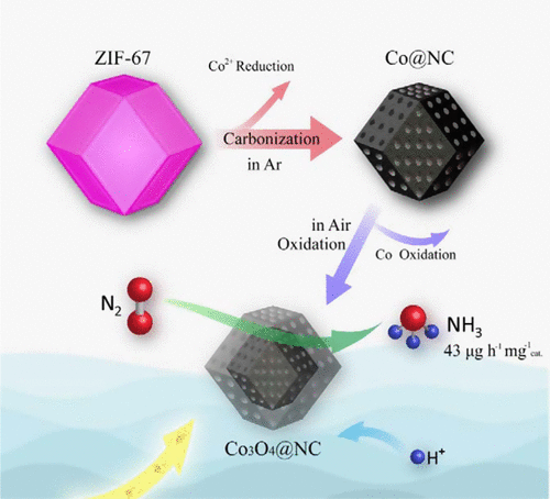 中国粉体网讯 近日,宁夏大学罗民教授课题组首次通过两步法(碳化和氧化热处理工艺)调控制备基于金属有机框架的纳米复合电催化剂材料,获得了具有新颖核壳结构的用于常温电化学固氮(NRR)的高效电催化剂。相关论文在线发表于《美国化学会—应用材料与界面》。