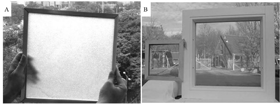 颗粒状气凝胶制备的玻璃(A)和整块气凝胶制备的玻璃(B)