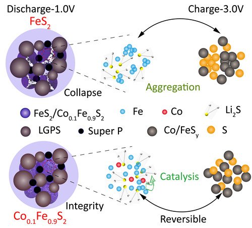 针对以上问题,中国科学院宁波材料技术与工程研究所所属新能源所研究员姚霞银团队与陈亮团队合作,通过第一性原理计算与实验相结合的方式,创新性地在FeS2中引入具有催化作用的过渡金属,达到了在不牺牲电池质量能量密度的前提下,提高FeS2在全固态锂电池中的反应动力学的目的。通过对比不同过渡金属(Cu、Co和Ni)对FeS2形貌及电化学性能的影响,筛选出Co对FeS2性能具有最优化作用(图1)。并且所得到的Co0.1Fe0.9S2具有最小的颗粒尺寸,这有利于提高材料的比表面积,缓解循环过程中的体积变化以及减小电化学反应过程中Li+的传输路径。电化学测试结果表明,是电化学反应中的决速步骤,而Co的加入,对该反应有明显的促进作用,使基于FeS2的全固态电池在500mAg-1电流密度下循环100圈后,可逆容量从197.1mAhg-1提高到543.5mAhg-1,该提升效果明显优于过渡金属Cu和Ni。