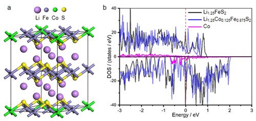 图2 (a) Li1.25Co0.125Fe0.875S2的结构图,(b) Li1.25FeS2 和 Li1.25Co0.125Fe0.875S2的电子态密度图