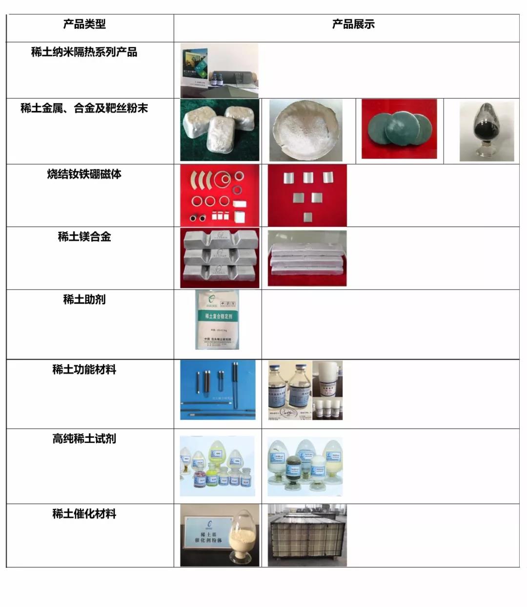 有稀土氧化物、单一稀土金属、混合稀土金属、各种稀土功能材料及特种稀土合金等。