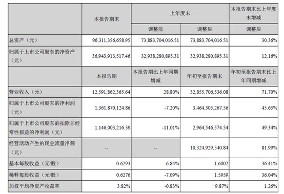 第三季度营收为125.92亿元,同比增长28.8%;归属股东净利润13.62亿元,同比下降7.2%。和上半年相比,第三季度宁德时代的营收和净利润的增速放缓。