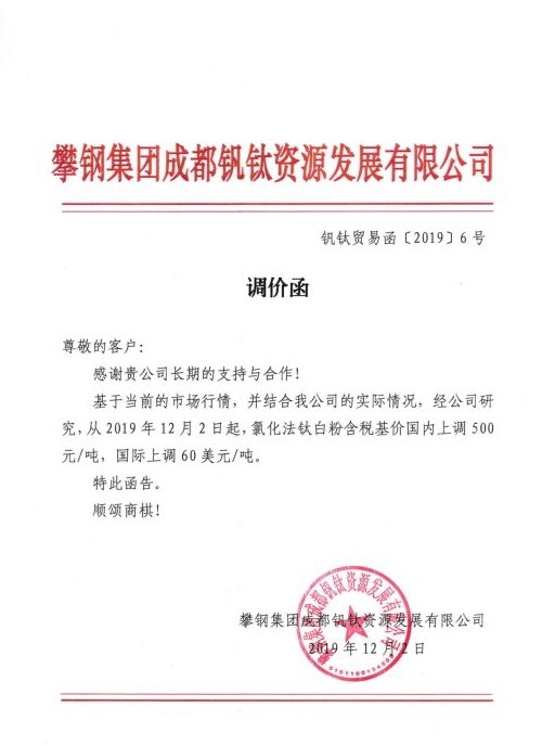 根据当前市场实际情况,公司研究决定,从12月2日起,我公司针对国内市场原销售价格基础上氯化法钛白粉销售价格上调500元/吨,国际市场原销售价格基础上氯化法钛白销售价格上调80美元/吨。