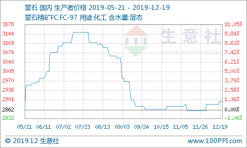 中国粉体网讯 12月19日萤石商品指数为101.56,与昨日持平,较周期内最高点127.49点(2019-01-03)下降了20.34%,较2016年12月18日最低点49.21点上涨了106.38%。(注:周期指2011-09-01至今)