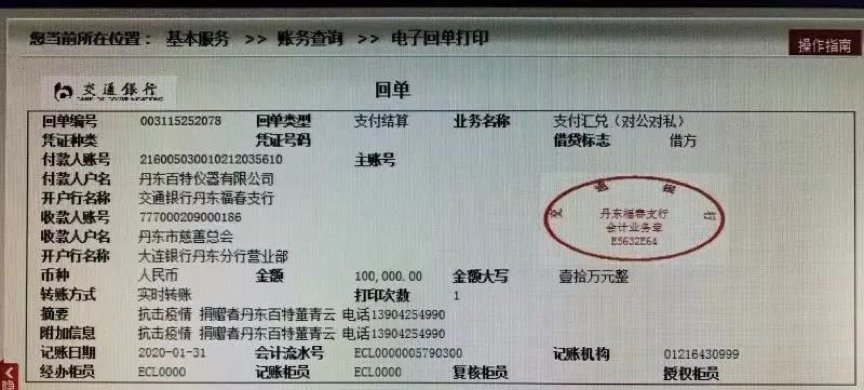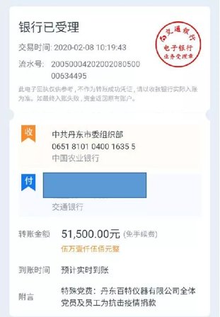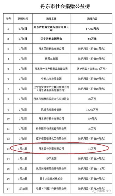 早在1月31日,百特就向丹东市慈善总会捐赠十万元,用于抗击疫情。
