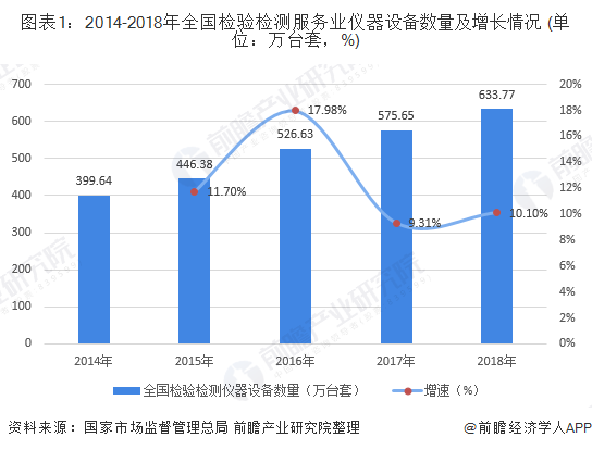 根据国家市场监督管理总局统计数据显示,2014-2018年,全国检验检测服务业仪器设备数量呈不断上升趋势,设备价值呈波动上升趋势。截止2018年底,我国共有检验检测仪器设备633.77万台套,同比上升10.10%;全部仪器设备资产原值3195.54亿元,同比上升9.57%。
