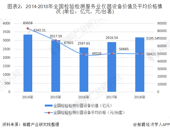 图表2:2014-2018年全国检验检测服务业仪器设备价值及平均价格情况 (单位:亿元,元/台套)