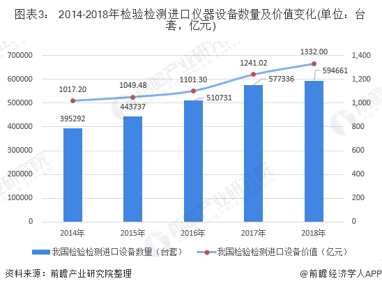 2014-2018年我国检验检测进口设备数量和价值呈不断上升趋势。截至2018年底,进口设备数量达到594661台套,进口设备价值达到1332亿元。