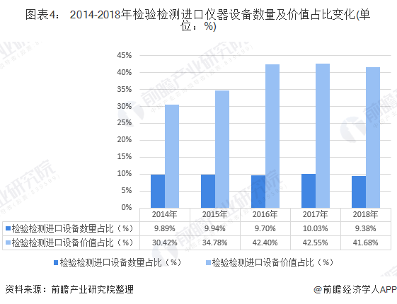 图表4: 2014-2018年检验检测进口仪器设备数量及价值占比变化(单位:%)