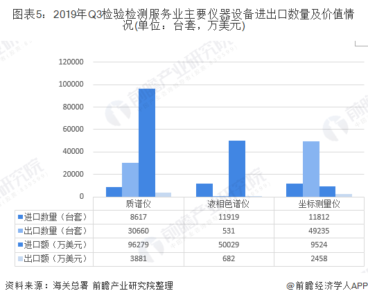 图表5:2019年Q3检验检测服务业主要仪器设备进出口数量及价值情况(单位:台套,万美元)
