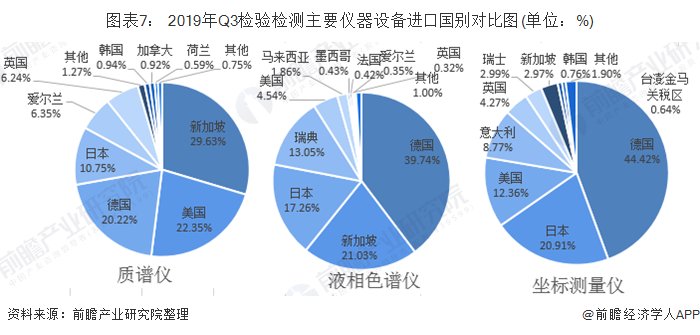从进口国别来看,2019年前三季度,我国主要从德国、美国、新加坡、日本等国家进口质谱仪、液相色谱仪和坐标仪等检验检测仪器。