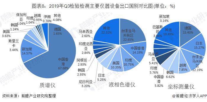图表8:2019年Q3检验检测主要仪器设备出口国别对比图(单位:%)