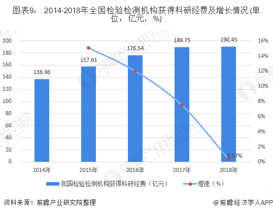 2014-2018年,我国检验检测机构获得科研经费呈不断上升趋势,但是增速呈不断下降趋势,且下降速度较快。2018年全国检验检测机构获得科研经费为190.45亿元,同比增长仅0.37%。