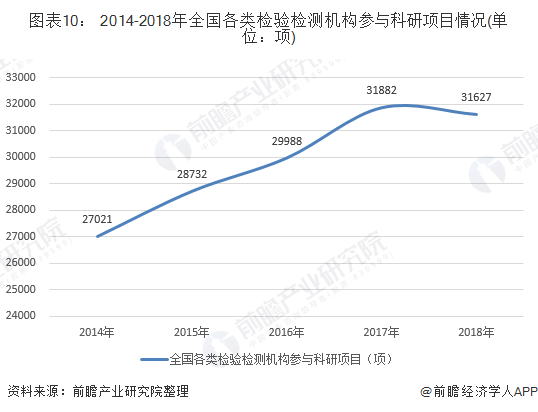 2018 年,全国各类检验检测机构参与科研项目总计31627 项,比去年减少255 项,一定程度上受到仪器设备的影响。科研项目的发展与我国检验检测设备的发展息息相关,未来我国应进一步加强自身设备的研发制造,提高科研力度,从而推动科研项目发展。