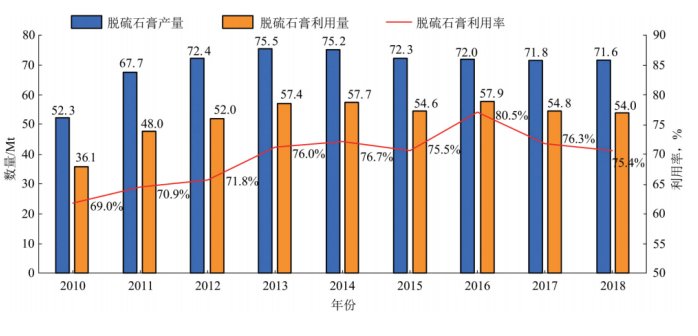 脱硫石膏又称排烟脱硫石膏、硫石膏或FGD石膏,主要成分和天然石膏一样,为二水硫酸钙CaSO4·2H2O,含量≥93%。自2016年以来,我国脱硫石膏的利用率基本都在75%以上,主要用作水泥缓凝剂。2018年我国脱硫石膏产量约为71. 6 Mt,综合利用量54. 0 Mt,利用率75. 4%。