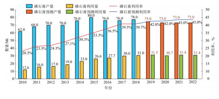 2018年我国磷石膏的产量约为78.0Mt,综合利用量31.0 Mt,综合利用率为39.7%。近年来,我国磷石膏的综合利用率在逐年增长,但是整体综合利用率仍处于较低的水平。