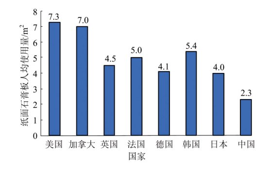 虽然我国是纸面石膏板生产大国,却不是生产强国。国外石膏应用主要是生产纸面石膏板,一般占石膏消耗量的 70%~80%,而我们的石膏消耗量只有约20%用于生产纸面石膏板。相比欧洲、美国、日本等发达国家,人均消费量也低。
