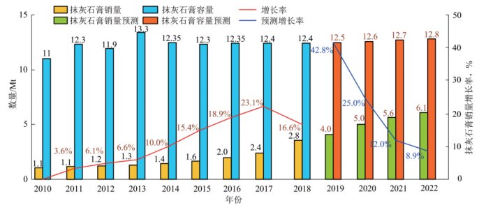 抹灰石膏作为一种最古老的的建筑材料之一,已经经历了上万年的应用与发展,这足以证明其顽强的生命力,尤其是近50-60年干混砂浆技术的快速发展,以及各种配方技术与施工技术的发展,抹灰石膏这种传统的建筑材料又迎来了一个最佳的发展时期。特别是随着抹灰石膏憎水技术的发展,抹灰石膏的耐水性能得到了一个较大的提升,抹灰石膏在室内装饰装修中将得到最大范围的应用。2018年国内抹灰石膏的用量已达到2.8Mt,预计2022年我国抹灰石膏的实际需求量将达6.1Mt。